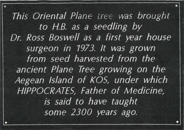The Oriental plane at Hawke’s Bay Fallen Soldiers’ Memorial Hospital is a documented “Hippocratic Plane”, raised from seed collected on the island of Kos, Greece and sent to Dr Barrie Tait. Archival correspondence from the Hawke’s Bay District Health Board records that the seedling was brought to Hawke’s Bay in 1973 by Dr Ross Boswell, who was one of the first graduates from the Auckland School of Medicine. The tree was later planted on the hospital grounds in 1974 by Dr Michael Bostock (1922 - 2015), a physician at the hospital from 1963–1987 (Hill, R.N., 2025).