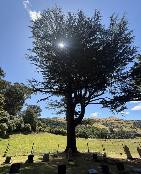 The site of the earliest Anglican church in Canterbury, dating to 1840. The current church is dated 1888. This cedar has a ever so slightly smaller paired planting directly opposite on the other side of the cemetery Hammer, J.R., 2025).
