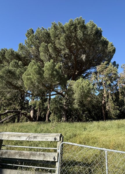A mature pine nut tree growing immediately beside another specimen of the same species. Local knowledge and site history suggest these trees may have been planted by Orton Bradley himself, making them of potential historical significance to the park and wider Canterbury region.